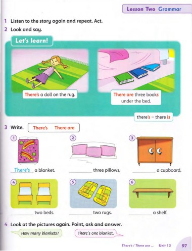 two beds. _ _ _ _ two rugs. ___ _ a shelf.
